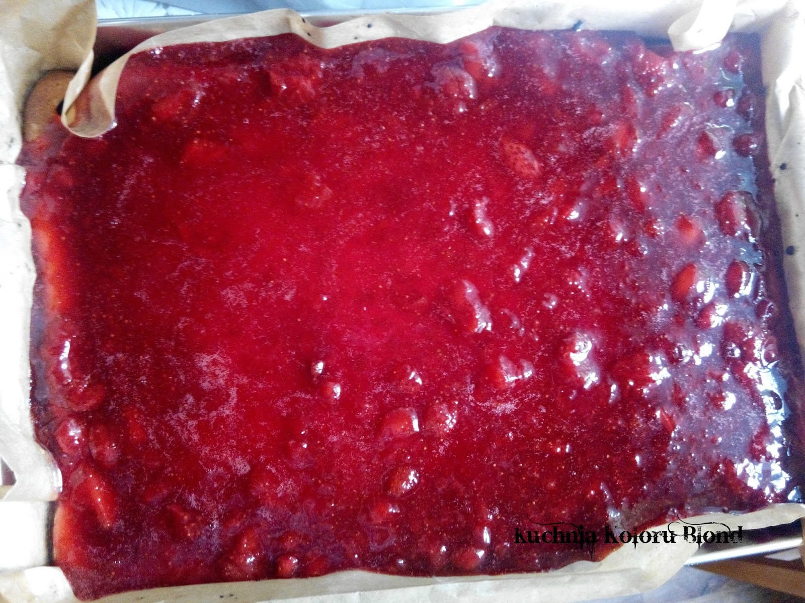 Gotową warstwę truskawkową wylewamy na upieczone ciasto. Nie zwlekamy z tym, bo masa szybko zastyga i tworzy naprawdę solidną galaretkę.